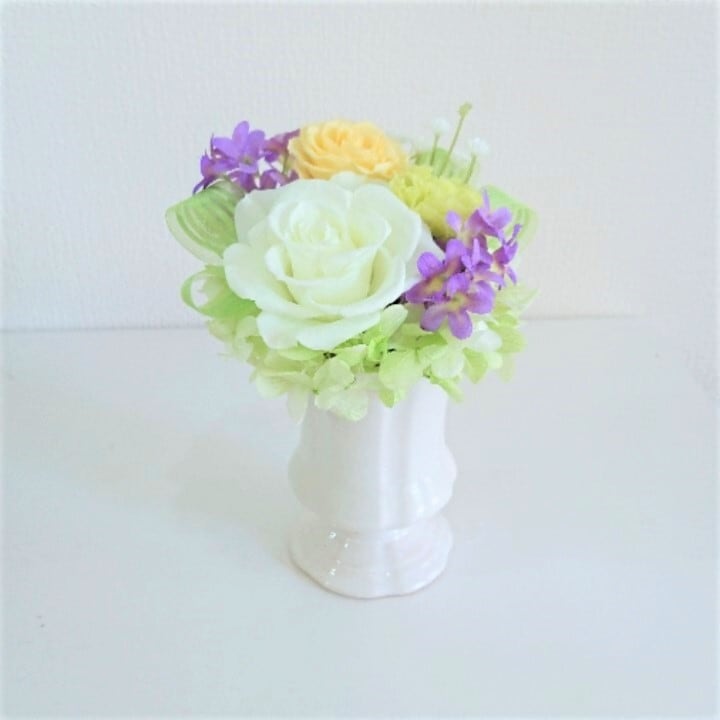 ホワイトの陶器ベースに淡いパステルカラーで柔らかく仕上げました。ふんわりとした優しい雰囲気になっています。母の日、お誕生日、さまざまな記念日、お祝い等ご贈答用にもご利用頂けます。